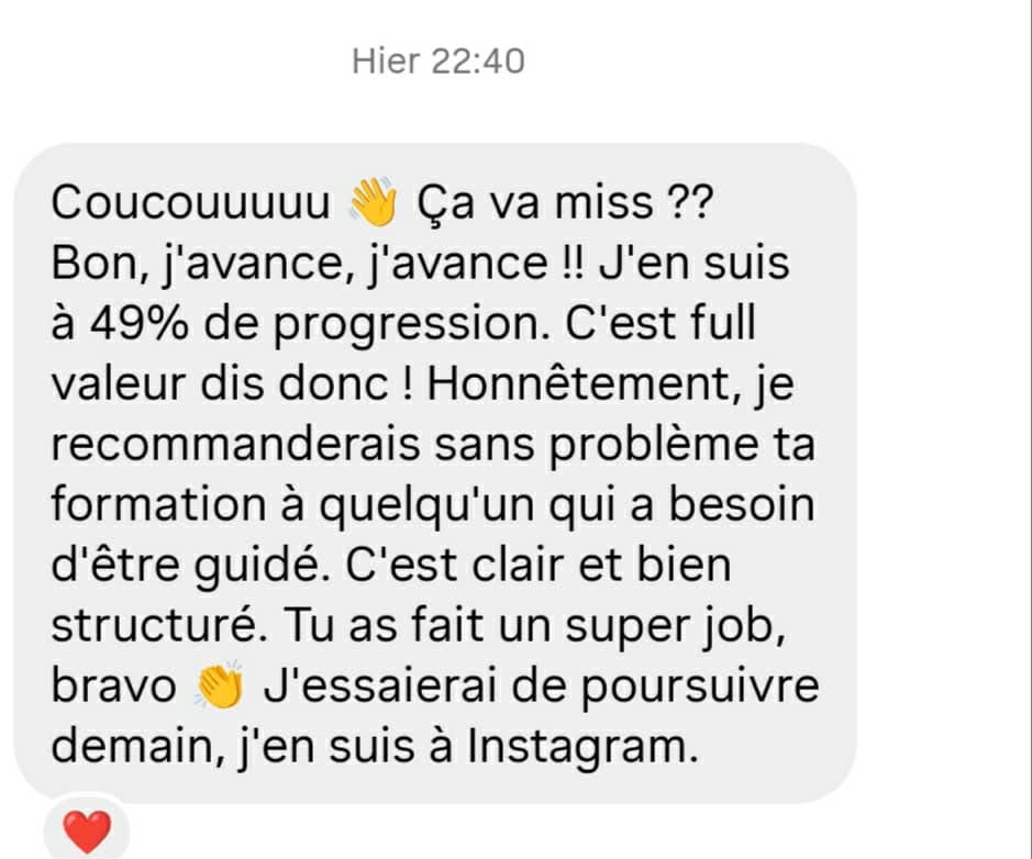 Il n'y a pas si longtemps, ma réalité était bien différente. J'avais un CDI en tant que caissiÚre puis la boite à fermer. L'année d'aprÚs j'ai étais diagnostiqué d'une d'endométriose profonde. AprÚs des années à naviguer dans le monde du VDI et à chercher ma véritable voie dans le business en ligne, j'ai tout testé. J'ai connu les doutes, les stratégies qui s'essoufflent et l'épuisement de créer du contenu dans le vide.De toutes ces expériences, j'ai tiré une leçon précieuse. Aujourd'hui, je sais exactement ce qui fonctionne réellement et ce qui n'est qu'une perte de temps et d'énergie.